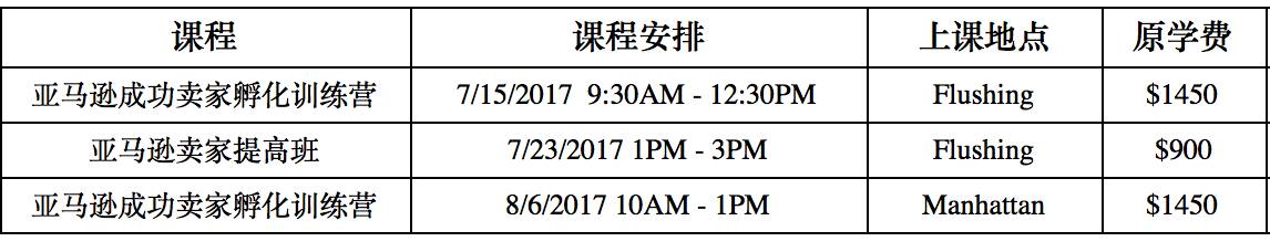| 亚马逊成功卖家孵化训练营 | 7/15/2017 9:30AM – 12:30PM | Flushing |