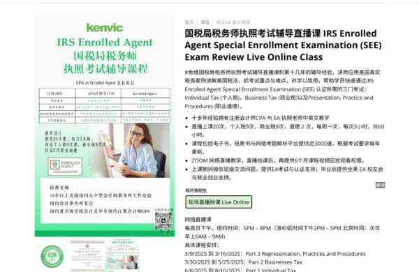 20次直播课程由EA+CPA导师授课,应用美国真实税务案例讲解美国税法,抓考试重点与难点,并学以致用,帮助学员快速通过IRS Enrolled Agent Special Enrollment Examination (SEE) 认证所需的三门考试。