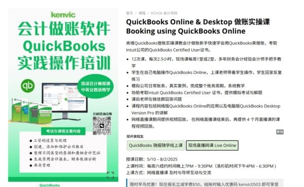 5月10号开班,12次ZOOM直播课,系统教授QuickBooks做账技能,适合会计新人、企业主及转行者。导师为千万级企业财务主管,持CPA、EA与MBA资质,实战经验丰富。