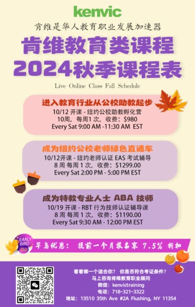 10月肯维教育项目3个课程开课。10/12号助教课程周六早上9:00-11:30开课,进入教育行业从公校助教起步。可以联系肯维报名参加:718-321-3322